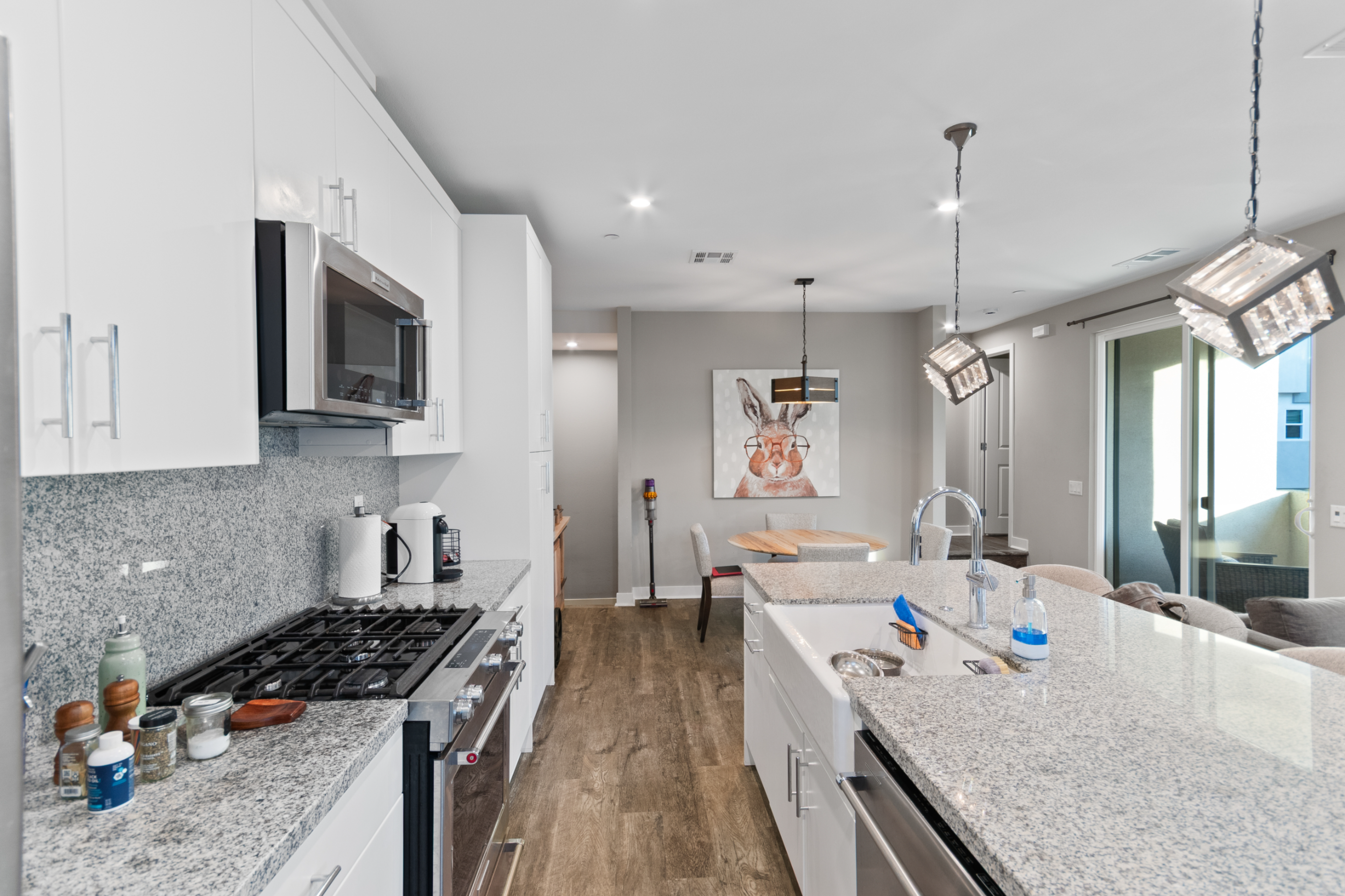 Welcome Home to your stunning three-story, end unit, 2024 build that perfectly blends style, comfort, and convenience. From the moment you enter, the open floor plan and recessed lighting create an airy, sophisticated atmosphere. Enjoy the convenience of a half bath, kitchen, living room, and dining area on one level. The brand new KitchenAid appliances gleam beneath sleek finishes, ready for your first dinner party or that late night snack run after catching a game at Angel Stadium or fireworks from Disneyland. When you are ready to retreat for the night, the top level has three bedrooms and two baths, giving ample room for every family member. With owned solar and a whole-house water filtration system, this home delivers modern efficiency without compromise. Each level flows effortlessly, showcasing thoughtful design and high-end details that make daily living a delight. Nestled in a gated community, you’ll enjoy peace of mind plus amenities like pool/spa, picnic area, and two dog runs for your furry companions. Come experience the perfect harmony of luxury and location — your next chapter begins here.